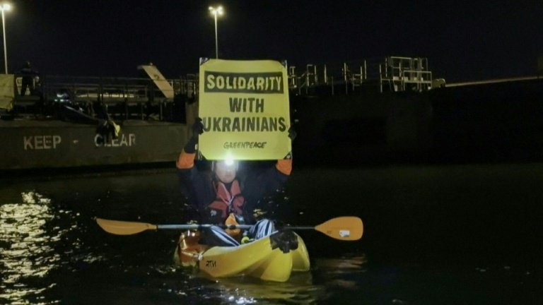 Sur une grande banderole était écrit "Uranium: EDF aime Poutine" (avec un coeur pour "aime") et "Stop aux contrats toxiques" ou encore "Solidarity with Ukrainians" sur de petits panneaux portés par des militants en kayak.